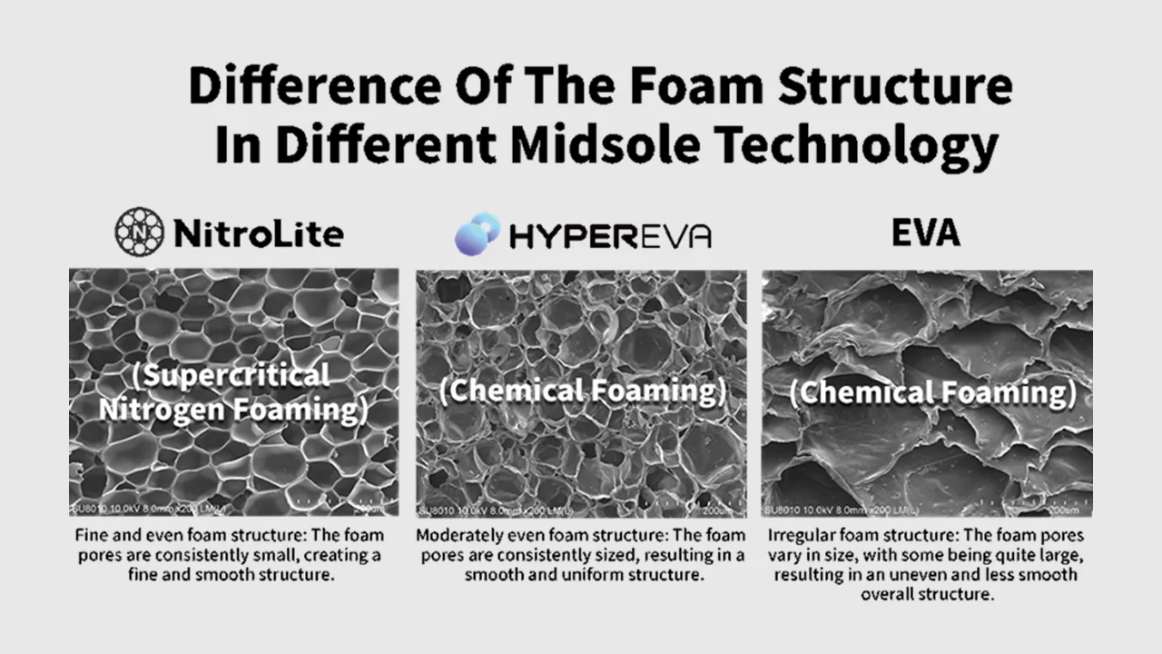NitroLiteinvolves impregnating high-performance EVA with nitrogen, causing rapid expansion. This process creates fine and even foam pores, resulting in a lightweight yet strong structure. This technology delivers both remarkable bounce and durability essential for competitive sports while also providing a more sustainable alternative to traditional chemical foaming manufacturing.