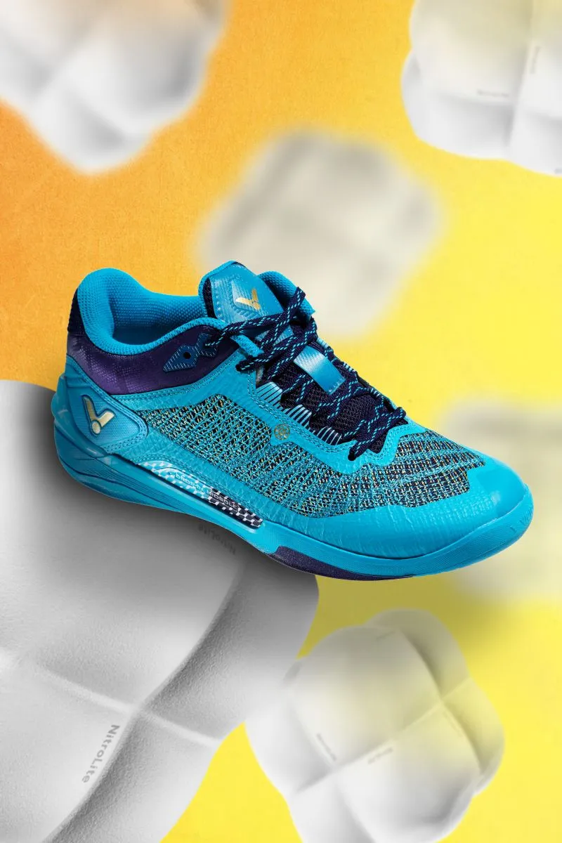 VG2NitroLite not only incorporates the most advanced technology in badminton shoe manufacturing but also showcases unique visual aesthetics with its Turkish Tile color scheme, accentuated by a touch of gold, making it a striking choice that captures attention among a diverse range of shoes.